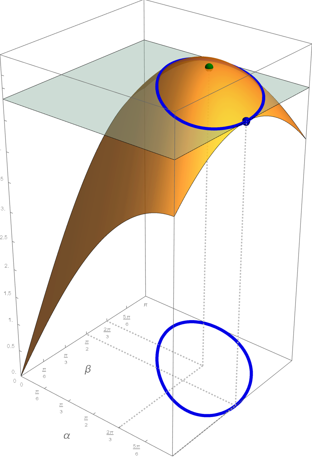 The right triangle with \(\alpha= \pi, \beta=\pi/2\) attracted my attention. The perimeter of this triangle is \(2+2\sqrt{2}.\) There are many other triangles with the same perimeter. On the graph of the perimeter function below, I emphasized the level curve \[ 2 \Bigl( \sin\bigl(\alpha/2\bigr) + \sin\bigl(\beta/2\bigr) + \sin\bigl((\alpha+\beta)/2\bigr) \Bigr) = 2+2\sqrt{2}. \] In the \(\alpha\beta\)-plane I emphasized all the pairs \((\alpha,\beta)\) which result in the triangles with the perimeter \(2+2\sqrt{2}.\) Three such pairs are given below \[ \bigl(\pi, \pi/2\bigr), \quad \bigl(\pi/2, \pi/2\bigr), \quad \bigl(\pi/2, \pi\bigr). \]