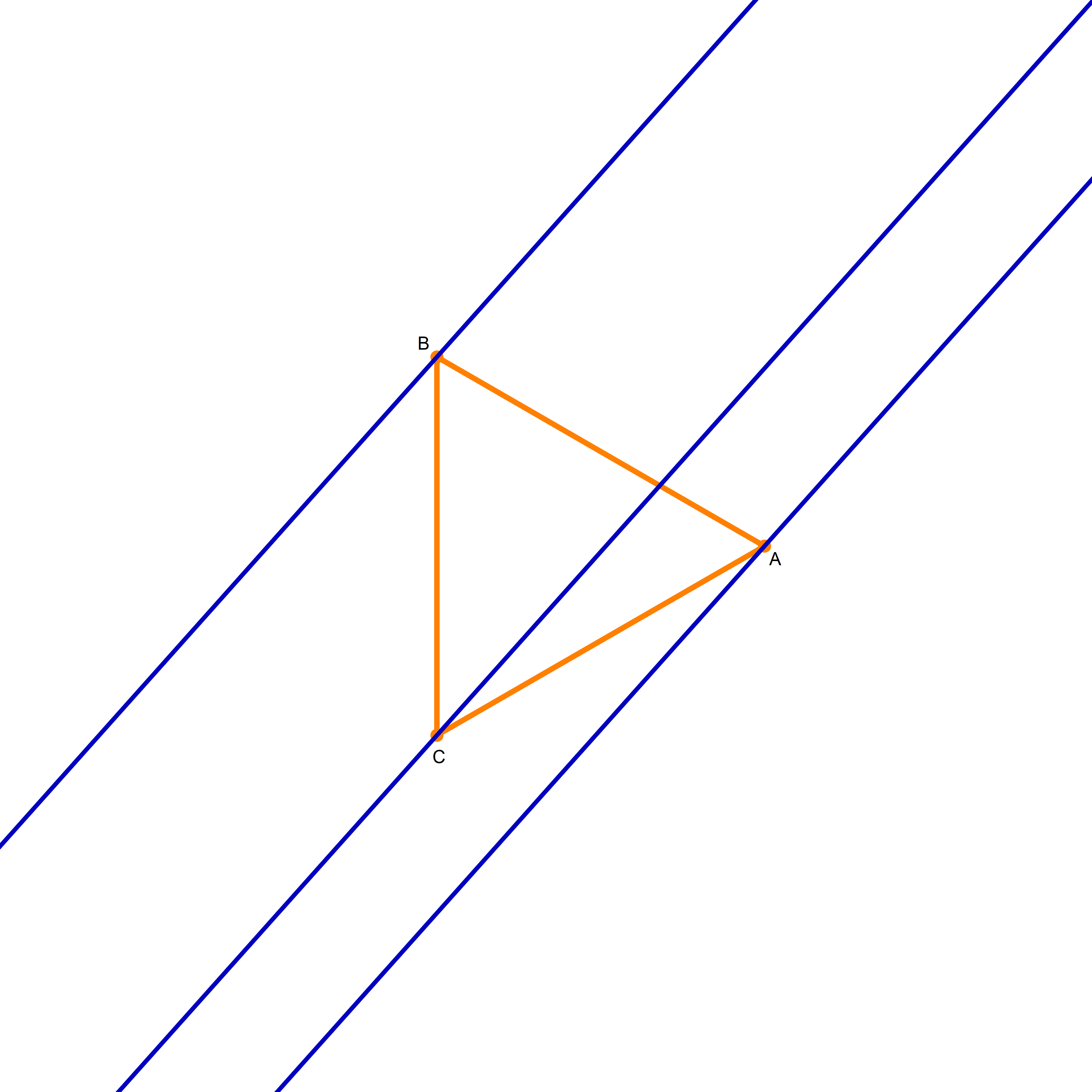 Notice that these four points form a very narrow parallelogram. A characterizing property of a parallelogram is that its diagonals share the midpoint. For this parallelogram, the coordinates of the common midpoint of the diagonals are \[ \overline{x} = \frac{1}{4}(2+3+5+6) = 4, \quad \overline{y} = \frac{1}{4}(3+2+1+0) = 3/2. \] The long sides of this parallelogram are on the parallel lines $y = -2x/3 +4$ and $y = -2x/3 + 13/3.$ It is natural to guess that the least square line is the line which is parallel to these two lines and half-way between them. That is the line $y = -2x/3 + 25/6.$ This line is the red line in the picture below. Clearly this line goes through the point $(4,3/2),$ the intersection of the diagonals of the parallelogram.