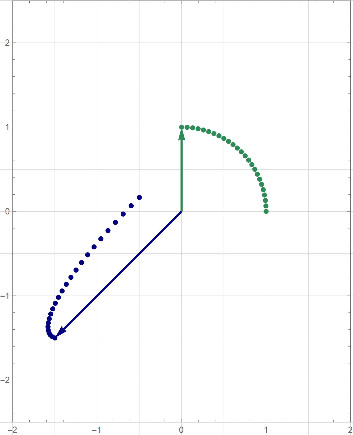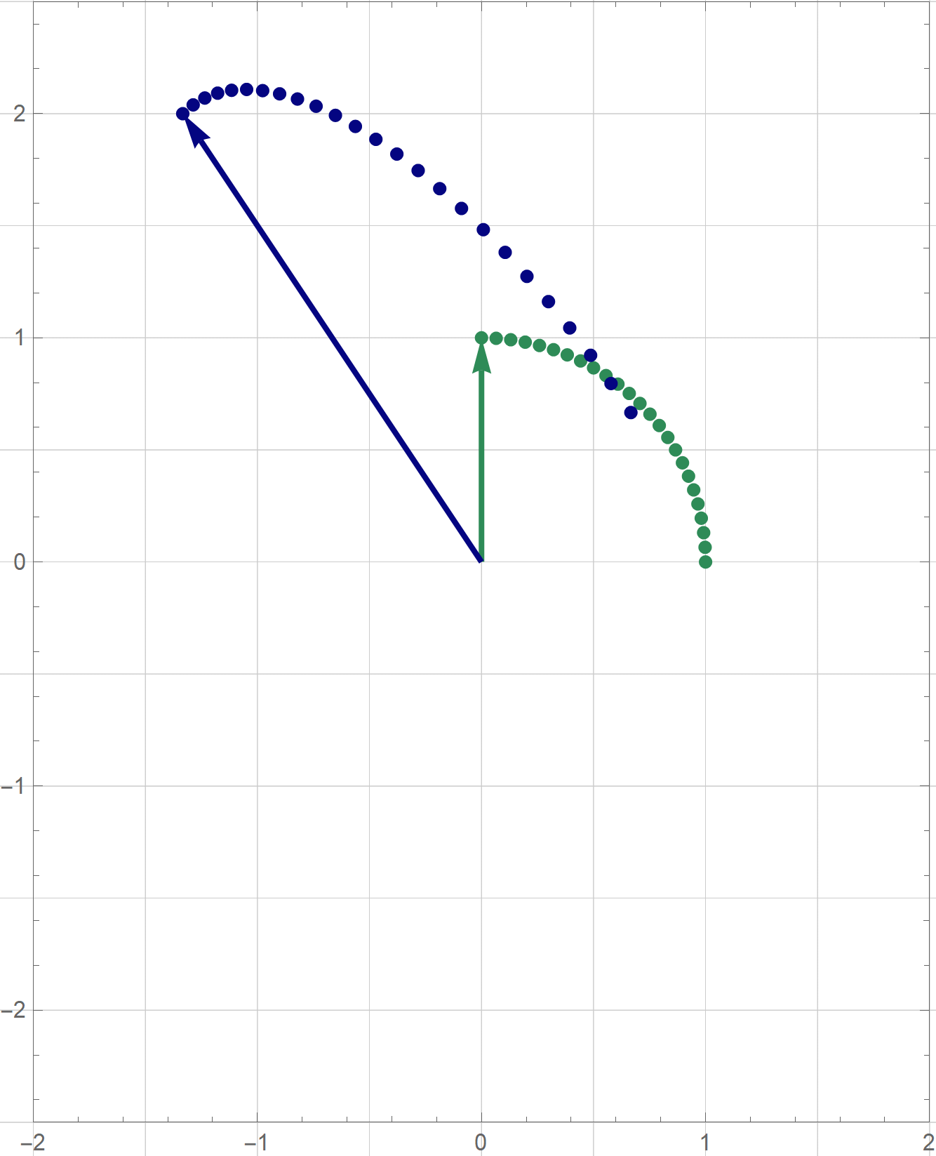 Vectors with Complex Entries. Let $\mathbf v$ be a vector with complex entries. By $\overline{\mathbf{v}}$ we denote the vector whose entries are complex conugates of the corresponding entries of $\mathbf v.$ That is, \[ \mathbf v = \left[\begin{array}{c} v_1 \\ \vdots \\ v_n \end{array} \right], \qquad \overline{\mathbf v} = \left[\begin{array}{c} \overline{v}_1 \\ \vdots \\ \overline{v}_n \end{array} \right]. \] The following calculation for a vector with complex entries is often useful \[ \mathbf{v}^\top \overline{\mathbf{v}} = \bigl[v_1 \ \ v_2 \ \ \cdots \ \ v_n \bigr] \left[\begin{array}{c} \overline{v}_1 \\ \overline{v}_2 \\ \vdots \\ \overline{v}_n \end{array} \right] = \sum_{k=1}^n v_k\, \overline{v}_k = \sum_{k=1}^n |v_k|^2 \geq 0. \] Moreover, \[ \mathbf{v}^\top \overline{\mathbf{v}} = 0 \quad \text{if and only if} \quad \mathbf{v} = \mathbf{0}. \] Equivalently, \[ \mathbf{v}^\top \overline{\mathbf{v}} \gt 0 \quad \text{if and only if} \quad \mathbf{v} \neq \mathbf{0}. \]