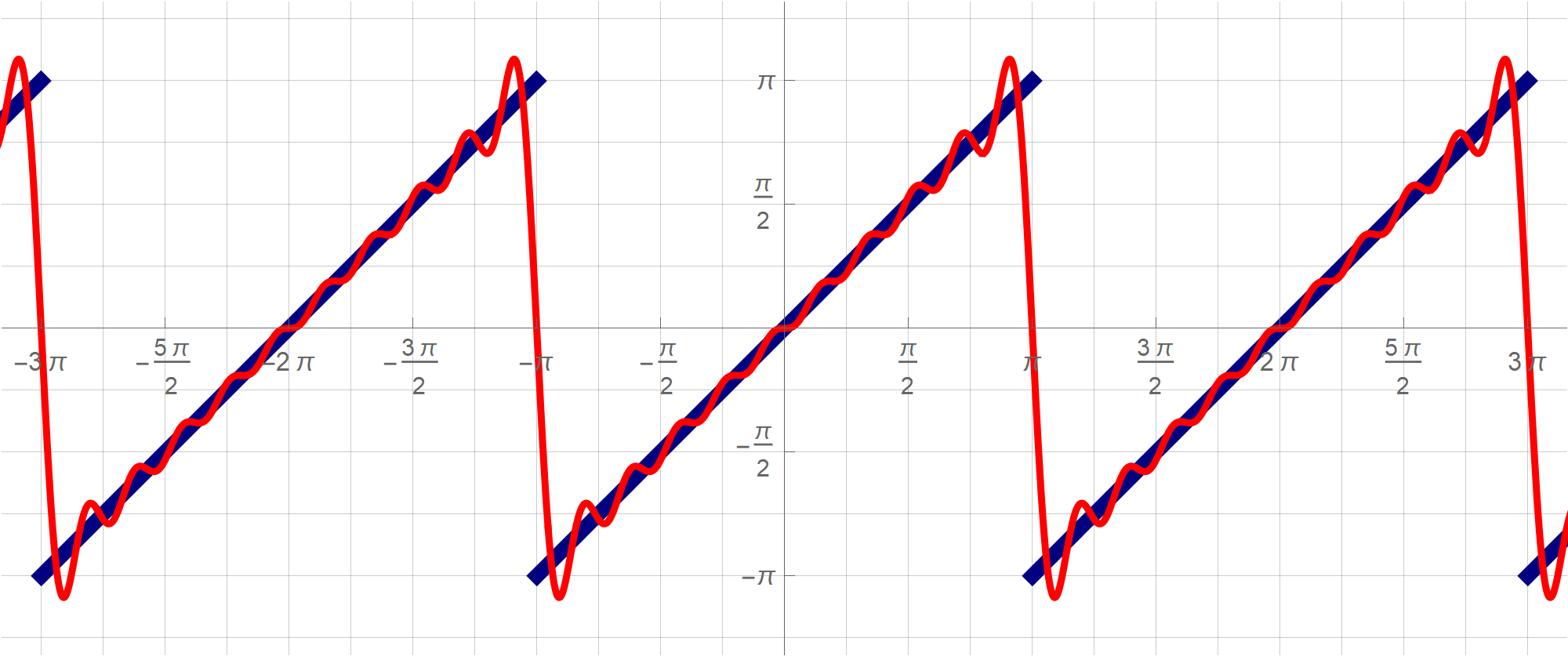 nn = 10; Plot[ {Mod[t, 2 Pi, -Pi], Sum[-((2 (-1)^k)/k)*Sin[k t], {k, 1, nn}]}, {t, -4 Pi, 4 Pi}, PlotPoints -> {100, 200}, PlotStyle -> {{RGBColor[0, 0, 0.5], Thickness[0.01]}, {RGBColor[1, 0, 0], Thickness[0.005]}}, Ticks -> {Range[-4 Pi, 4 Pi, Pi/2], Range[-4 Pi, 4 Pi, Pi/2]}, GridLines -> {Range[-4 Pi, 4 Pi, Pi/4], Range[-4 Pi, 4 Pi, Pi/4]}, PlotRange -> {{-3 Pi - 0.5, 3 Pi + 0.5}, {-Pi - 1, Pi + 1}}, AspectRatio -> Automatic, ImageSize -> 600 ]