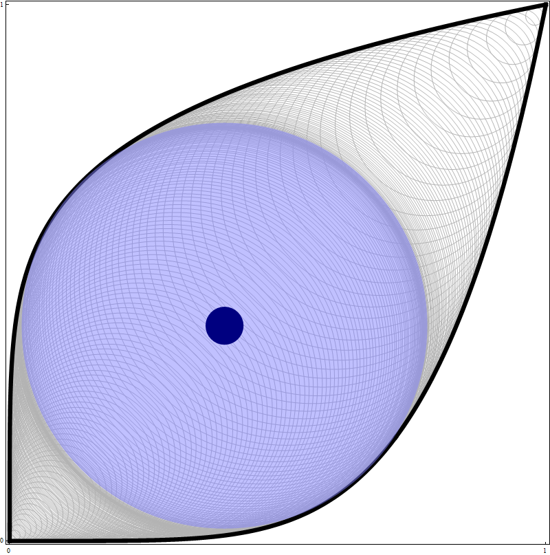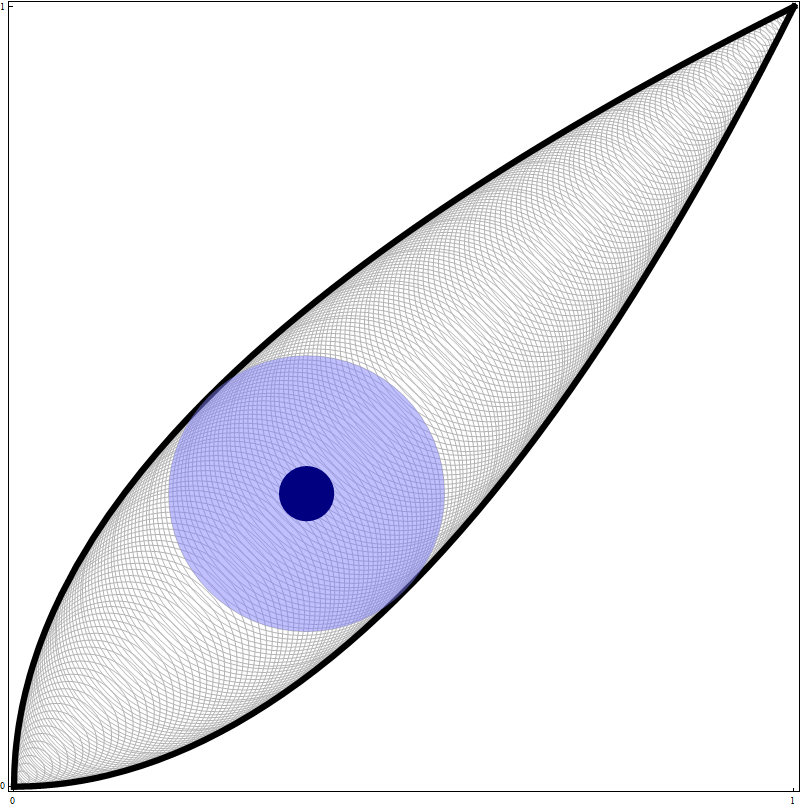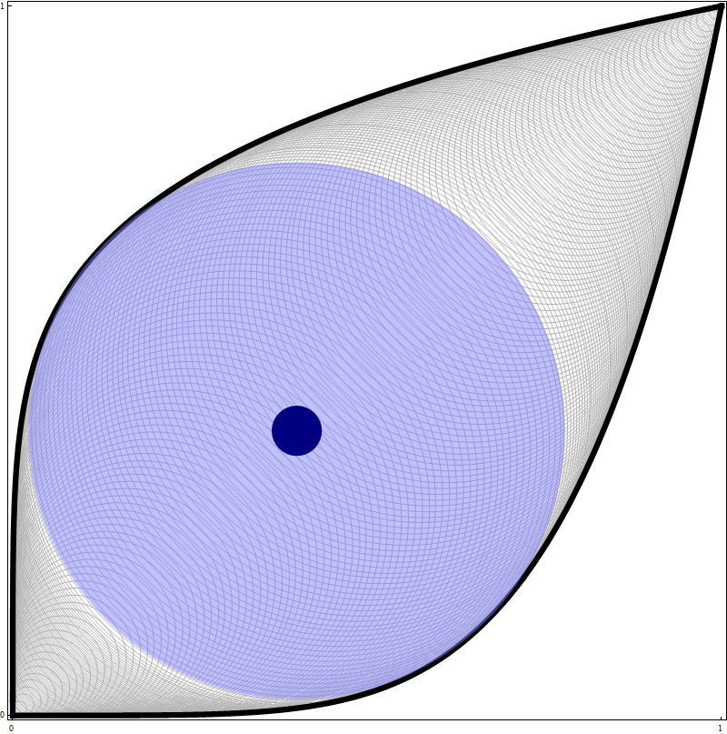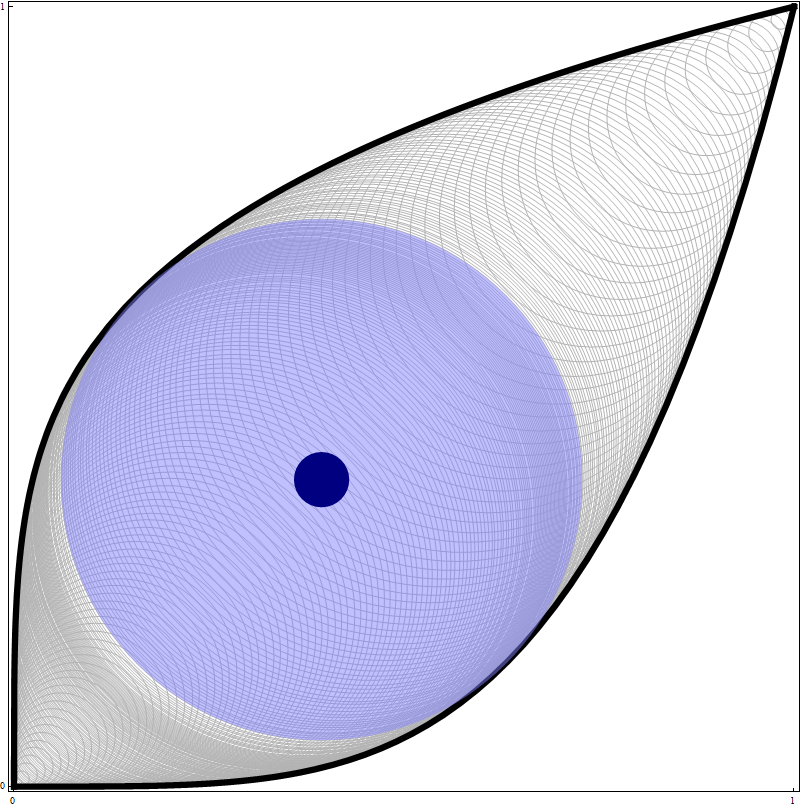 The functions $x^3$ and $\sqrt[3]{x}$ on $[0,1]$ and the maximal disk, with the oversized center, that touches both graphs. |