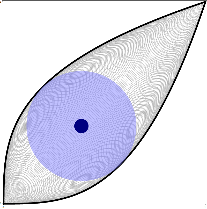 The functions $x^2$ and $\sqrt{x}$ on $[0,1]$ and the maximal disk, with the oversized center, that touches both graphs. |