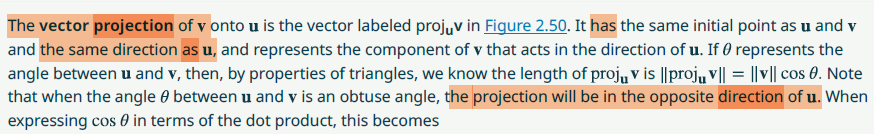 Reading just the orange words, one does not know whether the projection is in the same direction as \(\mathbf{u}\), or it can also be in the opposite direction of \(\mathbf{u}.\) In fact, if the angle between \(\mathbf{v}\) and \(\mathbf{u}\) is acute, then the projection of \(\mathbf{v}\) onto \(\mathbf{u}\) points in the same direction as \(\mathbf{u}\), and if the angle between \(\mathbf{v}\) and \(\mathbf{u}\) is obtuse, then the projection of \(\mathbf{v}\) onto \(\mathbf{u}\) points in the opposite direction of \(\mathbf{u}.\) The projection of \(\mathbf{v}\) onto \(\mathbf{u}\) is always colinear with \(\mathbf{u}.\) That is, it is a scalar multiple of \(\mathbf{u}.\)