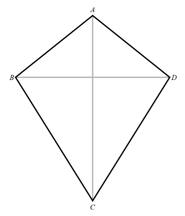 If \(ABCD\) is a deltoid with vertices \(A, B, C, D\), as shown below, then its diagonals \(\overline{AC}\) and \(\overline{BD}\) are perpendicular.