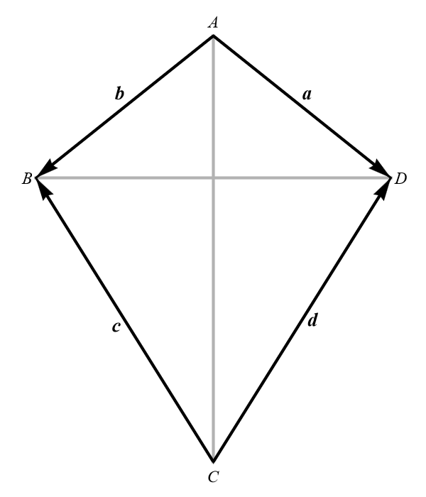 Proof (using vectors). Step 1. Introduce the following vectors by their representative line segments: \(\mathbf{a} = \overrightarrow{AB}\), \(\mathbf{b} = \overrightarrow{BC}\), \(\mathbf{c} = \overrightarrow{CD}\), and \(\mathbf{d} = \overrightarrow{DA}.\) Since \[ \mathbf{a} + \mathbf{b} + \mathbf{c} + \mathbf{d} = \mathbf{0}, \] we have that \[ \mathbf{b} + \mathbf{c} = - (\mathbf{a} + \mathbf{d}), \] (this vector is represented by the oriented line segment \(\overrightarrow{BD}\)) and \[ \mathbf{a} + \mathbf{b} = -(\mathbf{c} + \mathbf{d}). \] (this vector is represented by the oriented line segment \(\overrightarrow{AC}\)).