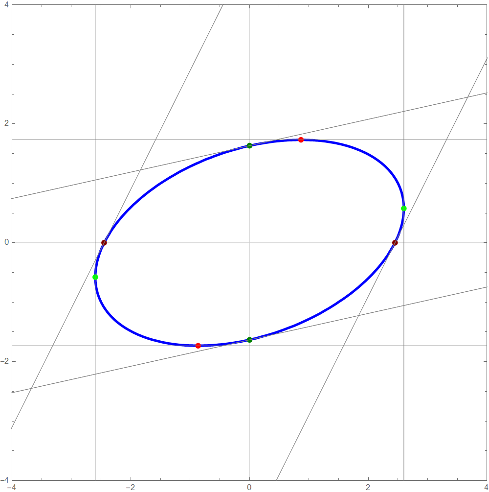 Today in class, I found the axes of the ellipse given by \(2 x^2 - 4 x y + 5 y^2 = 12.\) I used this example to introduce the method of Lagrange multipliers. The motivation comes from the picture below: the purple circles centered at the origin help identify the points on the blue ellipse that are closest to and farthest from the origin.
