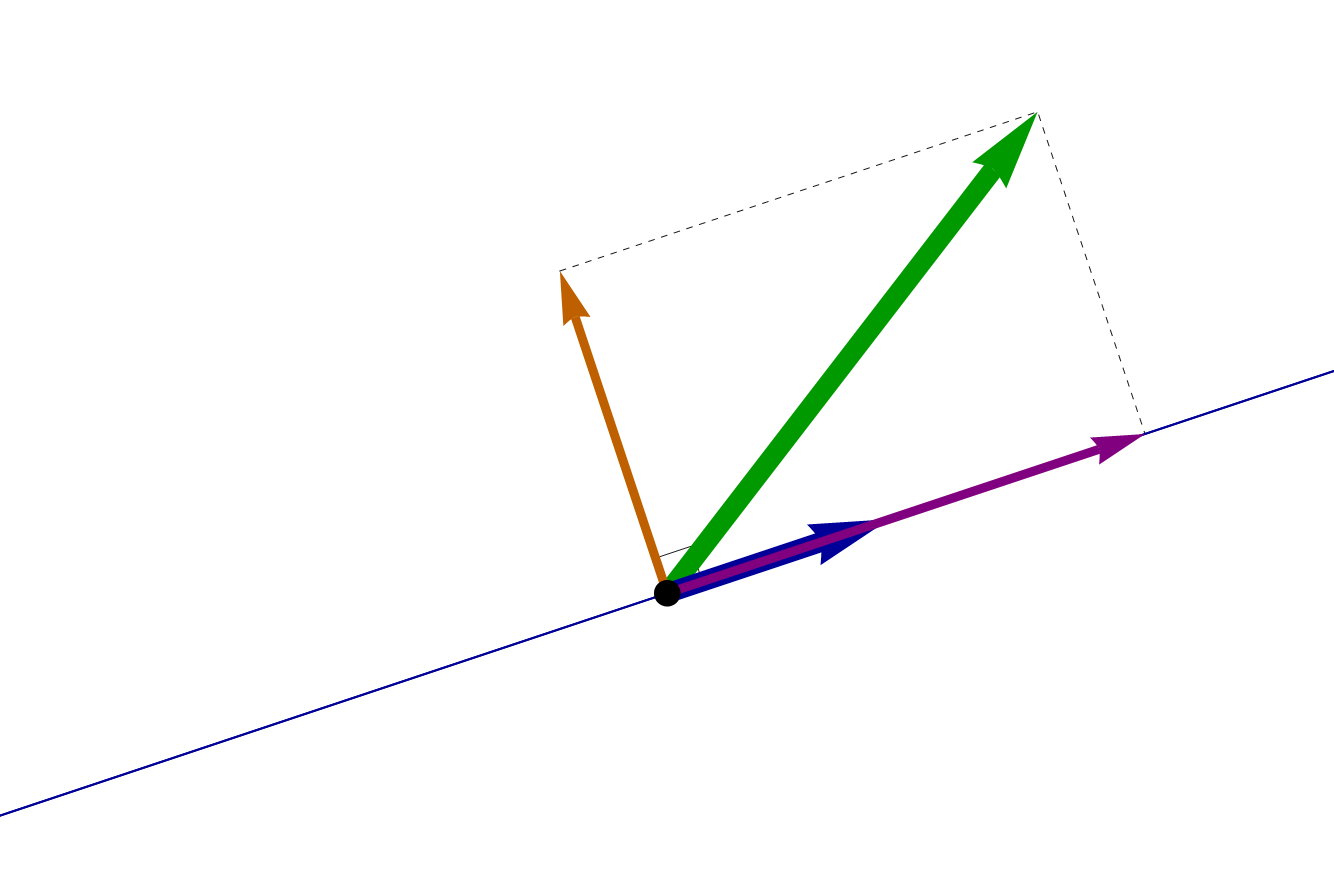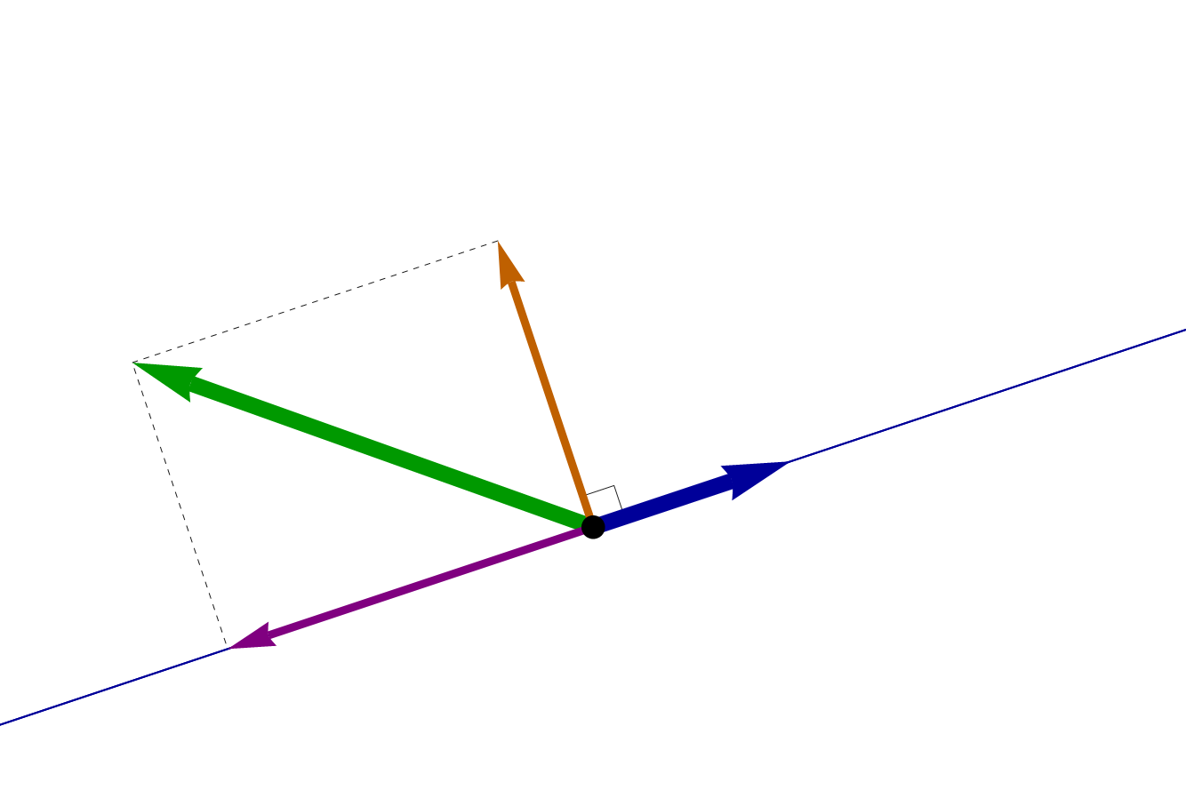 Now I can write a formula in which we see what is so special about the projection vector of \(\mathbf{v}\) onto \(\mathbf{u}\): \[ \mathbf{v} = \underbrace{\frac{\mathbf{v} \cdot \mathbf{u}}{\|\mathbf{u}\|^2}\,\mathbf{u}}_{\text{a multiple of } \mathbf{u}} + \underbrace{ \left(\mathbf{v} - \frac{\mathbf{v} \cdot \mathbf{u}}{\|\mathbf{u}\|^2}\,\mathbf{u} \right)}_{\text{orthogonal to } \mathbf{u}} \]