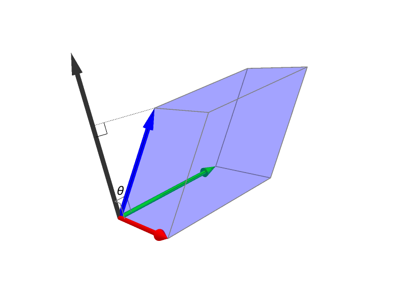 In the picture below, the red vector is \(\mathbf{a}\), the green vector is \(\mathbf{b}\), and the blue vector is \(\mathbf{c}.\) The black vector is \(\mathbf{a}\times \mathbf{b}\). The area of the parallelogram formed by \(\mathbf{a}\) and \(\mathbf{b}\) is \(\|\mathbf{a}\times \mathbf{b}\|.\) The height of the parallelepiped orthogonal to the parallelogram formed by \(\mathbf{a}\) and \(\mathbf{b}\) is \(\|\mathbf{c}\| \cos \theta.\) Therefore, the volume of the parallelepiped is \[ \|\mathbf{a}\times \mathbf{b}\| \mkern 2mu \bigl(\|\mathbf{c}\| \cos \theta \bigr) = (\mathbf{a}\times \mathbf{b})\cdot \mathbf{c}, \] if \(\theta\) is such that \(0 \leq \theta \lt \pi/2\) (like in the picture below) and it is \[ \|\mathbf{a}\times \mathbf{b}\| \mkern 2mu \bigl(\|\mathbf{c}\| \mkern 1mu \bigl| \cos \theta \bigr| \bigr) = \bigl| (\mathbf{a}\times \mathbf{b})\cdot \mathbf{c} \bigr| , \] if \(\theta\) is such that \(\pi/2 \leq \theta \leq \pi.\) This second case occurs if the vectors \(\mathbf{a},\) \(\mathbf{b},\) and \(\mathbf{c}\) do not satisfy the right-hand rule.