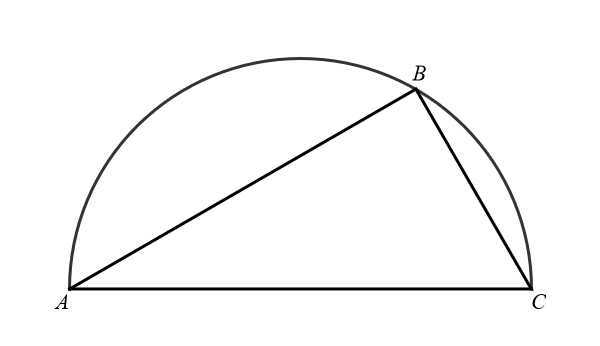 Theorem of Thales. If \(A\), \(B\), and \(C\) are points on a circle with diameter \(\overline{AC}\), then the angle at \(B\) is a right angle. Conversely, if the triangle \(ABC\) is a right triangle with the right angle at \(B\), then \(B\) lies on the circle having \(\overline{AC}\) as its diameter.