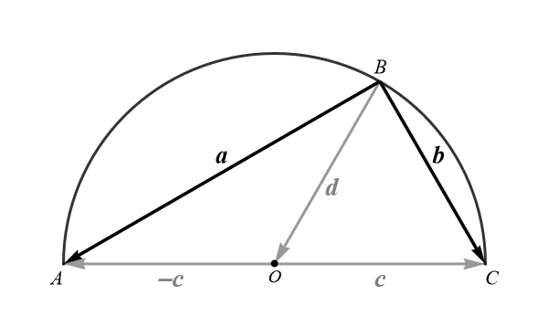 Proof (using vectors). Assume that \(A\), \(B\), and \(C\) are points on a circle with diameter \(\overline{AC}.\) Our goal is to prove that the line segments \(\overline{BA}\) and \(\overline{BC}\) are orthogonal. The dot product of vectors is an efficient tool for proving orthogonality. Therefore we use vectors in this proof.