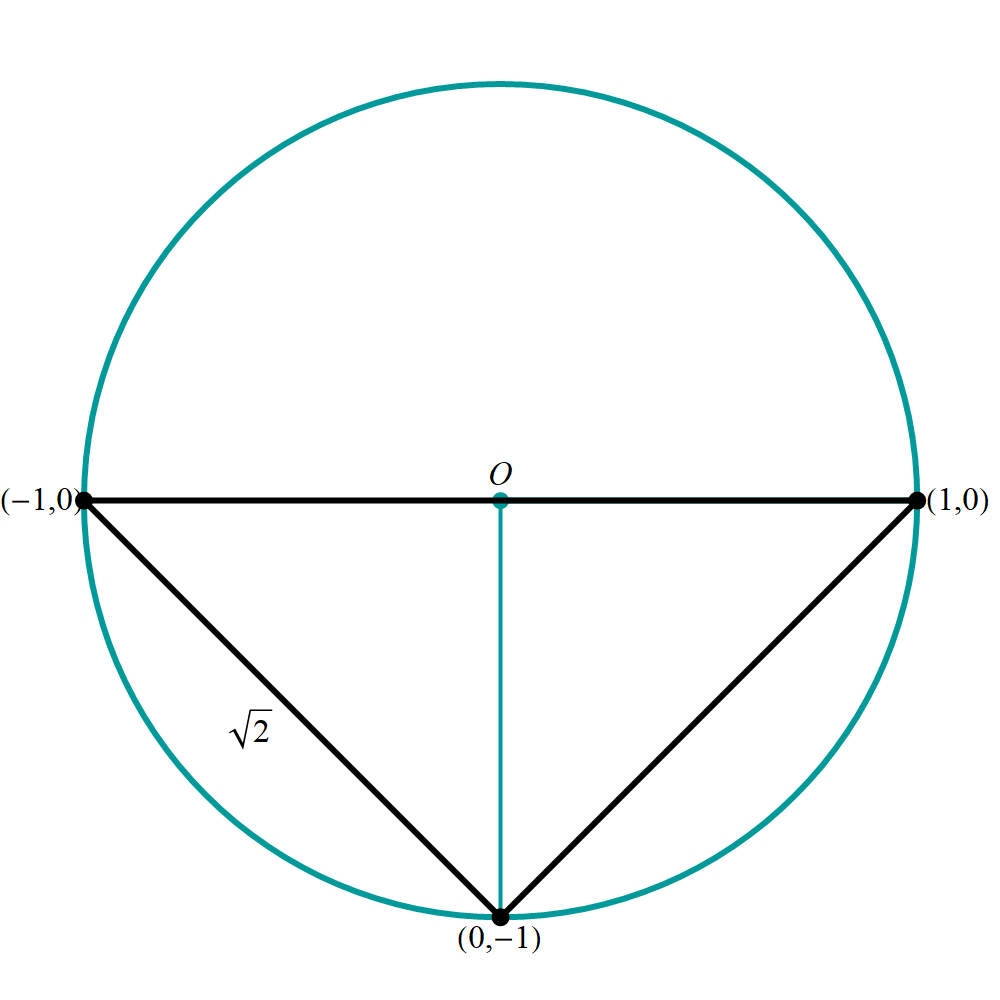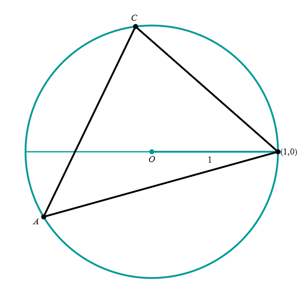 Positioning of a triangle inscribed in the unit circle. Every triangle inscribed in the unit circle can be rotated so that one vertex is at the point \((1,0),\) and one of the remaining vertices is above, and the other one below the horizontal diameter. If the triangle is obtuse or right, the vertex corresponding to the obtuse or right angle is rotated to the point \((1,0).\) If the triangle is acute, any vertex can be rotated to \((1,0).\) The four pictures below illustrate this claim.