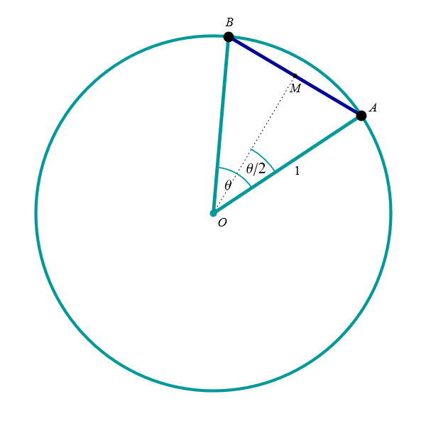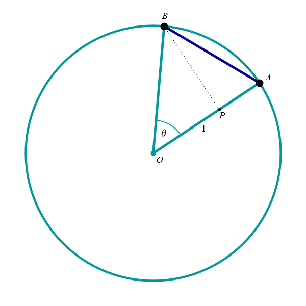 Calculating length of a cord. In the figure with the capture "Cord length" you can see how the length of the cord \(\overline{AB}\) in the unit circle is expressed in terms of the central angle \(\theta,\) where \(\theta \in (0,\pi),\) that is \(\theta\) is an angle less than \(\pi.\) The length of \(\overline{AB}\) is equal to \(2 \sin(\theta/2).\) To prove this claim mark by \(M\) the midpoint of the cord \(\overline{AB}.\) Then the line \(OM\) is orthogonal to the line \(AB\) and the angle \(\measuredangle MOA\) is equal to \(\theta/2.\) Since the length of the line segment \(\overline{OM}\) is \(1,\) the length of \(\overline{AM}\) is \(\sin(\theta/2).\) Since \(M\) is the midpoint of the cord \(\overline{AB},\) the length of \(\overline{AB}\) is \(2 \sin(\theta/2).\) Looking at this formula, we notice that it is also valid for \(\theta = 0,\) when the cord is just a point, and for \(\theta = \pi\) when the cord is a diameter.