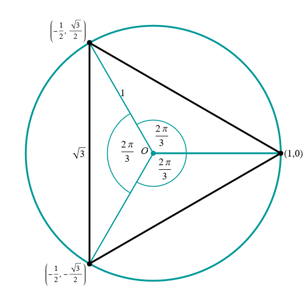 Going back to the meaning of the angles \(\alpha\) and \(\beta\) we see that \[ \alpha = \frac{2\pi}{3}, \quad \beta = \frac{2\pi}{3}. \] give the equilateral triangle. Thus, the triangle with the maximum perimeter inscribed in the unit circle is the equilateral triangle.