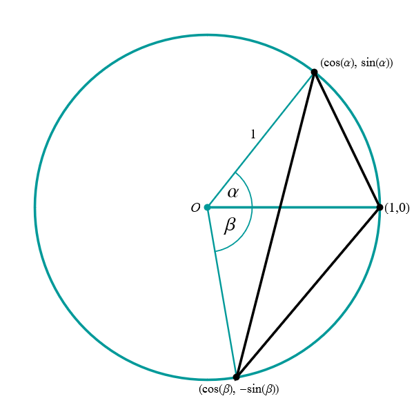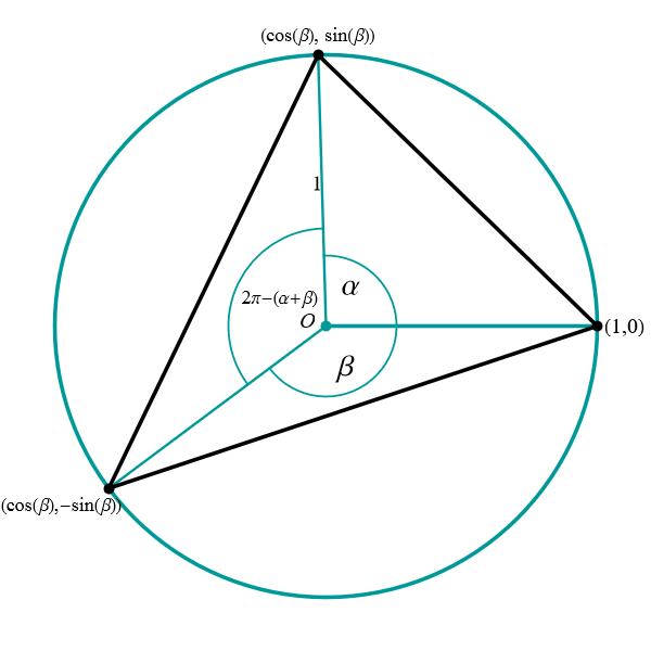 Looking at the obtuse triangle, we see that all the angles \(\alpha,\) \(\beta,\) and \(\alpha+\beta\) are less or equal to \(\pi.\) Using the result from calculating length of a cord, the length of the cord connecting the points $\bigl( \cos\alpha, \sin\alpha\bigr)$ and $(1,0)$ is \(2 \sin(\alpha/2).\) The length of the cord connecting the points $\bigl( \cos\beta, -\sin\beta \bigr)$ and $(1,0)$ is \(2 \sin(\beta/2).\) The length of the cord connecting the points $\bigl( \cos\beta, -\sin\beta \bigr)$ and $\bigl( \cos\alpha, \sin\alpha\bigr)$ is \(2 \sin\bigl((\alpha+\beta)/2\bigr).\) Thus the perimeter is \[ 2 \Bigl( \sin\bigl(\alpha/2\bigr) + \sin\bigl(\beta/2\bigr) + \sin\bigl((\alpha+\beta)/2\bigr) \Bigr). \]