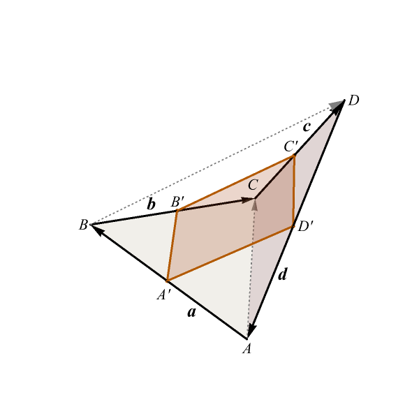 Step 2. In triangle \(AA'D'\) we have that the oriented line segment \(\overrightarrow{A'D'}\) represents the vector \(-\frac{1}{2}(\mathbf{a} + \mathbf{d}).\) In triangle \(CB'C'\) we have that the oriented line segment \(\overrightarrow{B'C'}\) represents the vector \(\frac{1}{2}(\mathbf{b} + \mathbf{c}).\) Since we have \[ -\frac{1}{2}(\mathbf{a} + \mathbf{d}) = \frac{1}{2}(\mathbf{b} + \mathbf{c}), \] the oriented line segments \(\overrightarrow{A'D'}\) and \(\overrightarrow{B'C'}\) are equivalent. That is they are parallel and have equal length.