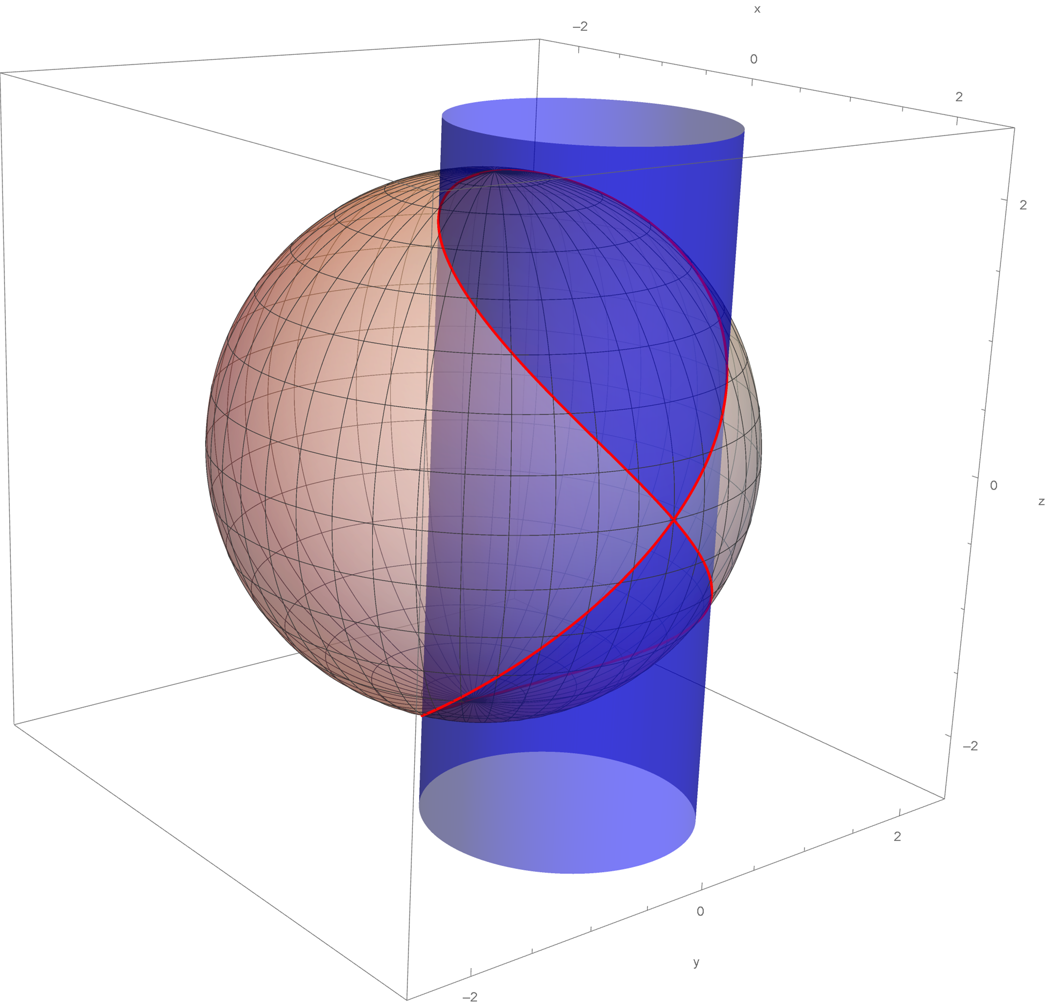 Before moving on to the new topic, I wanted to share with you the derivation of the parametric equations of the Viviani Curve, Problem 355 in Section 2.6. The Viviani Curve is the intersection of the sphere of radius \(2\) centered at the origin and the circular cylinder or radius \(1\) whose axis is the line \(x=1, y = 0, z = t\) where \(t \in \mathbb{R}.\)