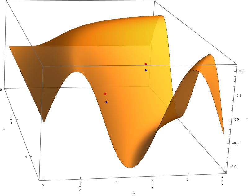Solution. Let \(x, y\) and \(z\) be positive real numbers such that \(xyz = 1.\) To find the extreme value of \(x+y+z\) we solve \(xyz = 1\) for \(z = 1/(xy)\) and consider \(x+y+z = x + y + 1/(xy),\) which is a function of two independent variables \[ F(x,y) = x+y+ \frac{1}{xy}. \] Let us find the partial derivatives of this function \[ F_x(x,y) = 1 - \frac{1}{x^2 y}, \quad F_y(x,y) = 1 - \frac{1}{y^2 x}. \] and solve to find the critical points \[ 1 - \frac{1}{x^2 y} = 0, \quad 1 - \frac{1}{y^2 x} = 0. \] Therefore, \(x^2 y = y^2 x\) and consequently, \(x = y.\) Thus, the only critical point is \(x = 1, y= 1.\)