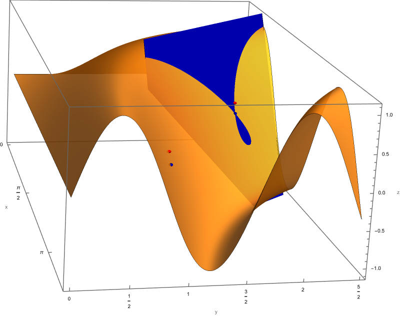 To find the discriminant at this critical point we calculate \[ F_{xx}(x,y) = \frac{2}{x^3 y}, \quad F_{yy}(x,y) = \frac{2}{y^3 x}, \quad F_{xy}(x,y) = \frac{1}{x^2 y^2}, \] evaluated at \(x = 1, y= 1\) to be \(F_{xx}(1,1) = 2,\) \(F_{yy}(1,1) = 2,\) and \(F_{xy}(1,1) = 1.\) Thus, the discriminant is \(2\cdot 2 - 1^2 = 3,\) and the critical point \(x = 1, y= 1\) is a local minimum, \[ F(1,1) = 1+1+ \frac{1}{1} = 3. \]