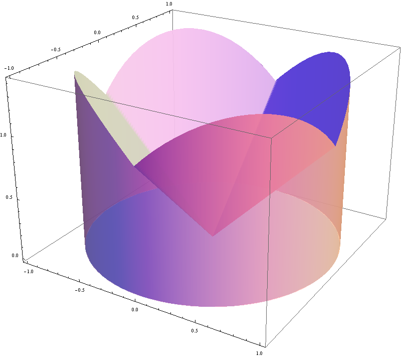Notice that the square $S$ consists of $8$ triangles which are congruent to $S_0.$ The volume pictured above has several symmetries which allow us to calculate in polar coordinates: