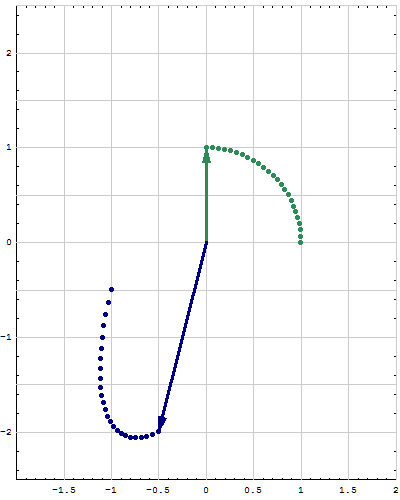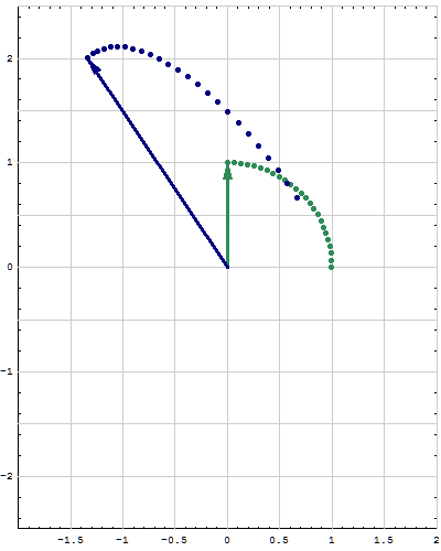 Here are animations of different matrices in action. In each scene the navy blue vector is the image of sea green vector under multiplication by a matrix A. For easier visualization of the action the heads of the vectors leave traces. Just looking at the movies you can guess what the matrix is in each movie. You can also see what its eigenvalues and eigenvectors are, whether they are positive, negative, complex, ...