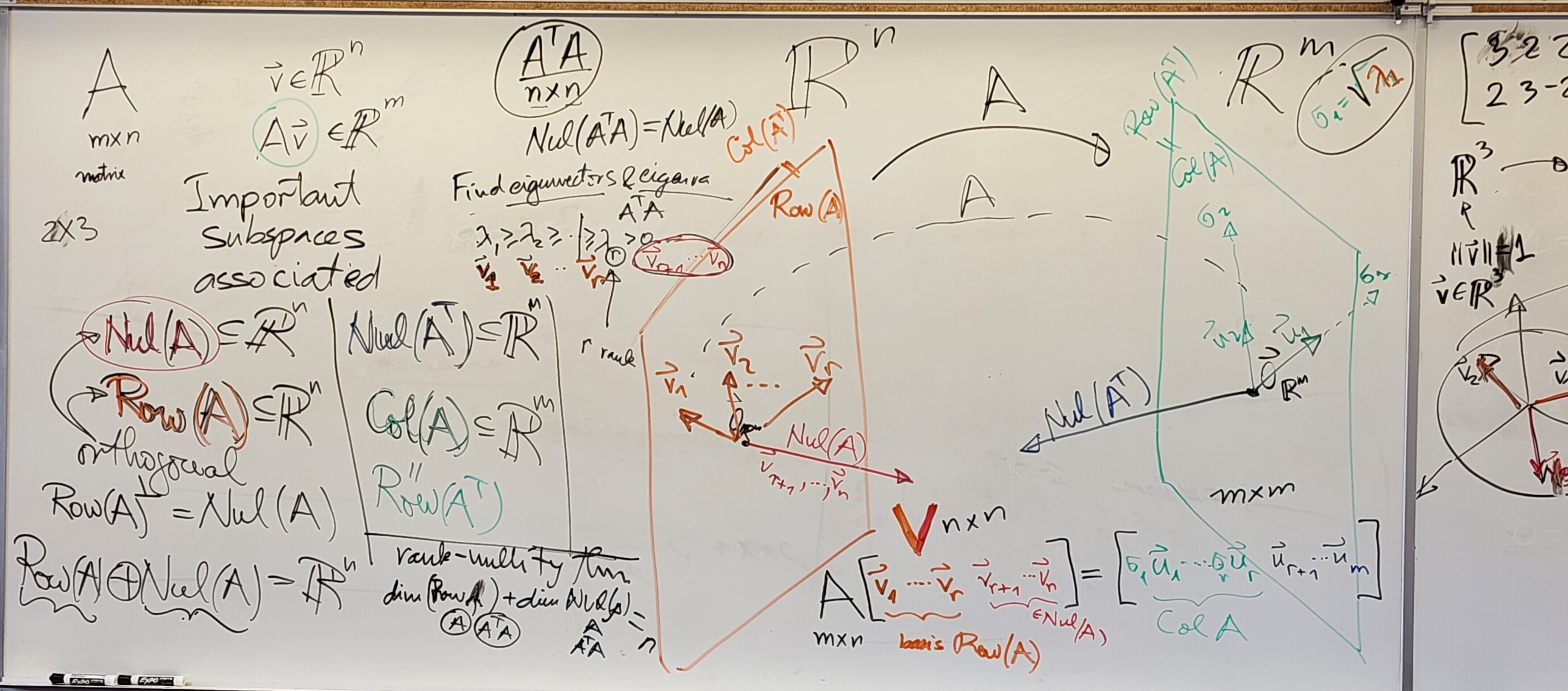 Proof 1. The following equalities we established earlier: \begin{align*} \operatorname{Col}(A^\top\!\! A ) & = \operatorname{Row}(A^\top\!\! A ) = \bigl( \operatorname{Nul}(A^\top\!\! A ) \bigr)^\perp, \\ \operatorname{Col}(A^\top) & = \operatorname{Row}(A) = \bigl( \operatorname{Nul}(A) \bigr)^\perp \end{align*} In the above Theorem we proved the following subspaces are equal \[ \operatorname{Nul}(A^\top\!\! A ) = \operatorname{Nul}(A). \] Equal subspaces have equal orthogonal complements: \[ \bigl(\operatorname{Nul}(A^\top\!\! A )\bigr)^\perp = \bigl( \operatorname{Nul}(A) \bigr)^\perp. \] Since earlier we proved \[ \operatorname{Col}(A^\top\!\! A ) = \bigl( \operatorname{Nul}(A^\top\!\! A ) \bigr)^\perp \quad \text{and} \quad \operatorname{Col}(A^\top) = \bigl( \operatorname{Nul}(A) \bigr)^\perp, \] the last three equalities imply \[ \operatorname{Col}(A^\top\!\! A ) = \operatorname{Col}(A^\top). \]