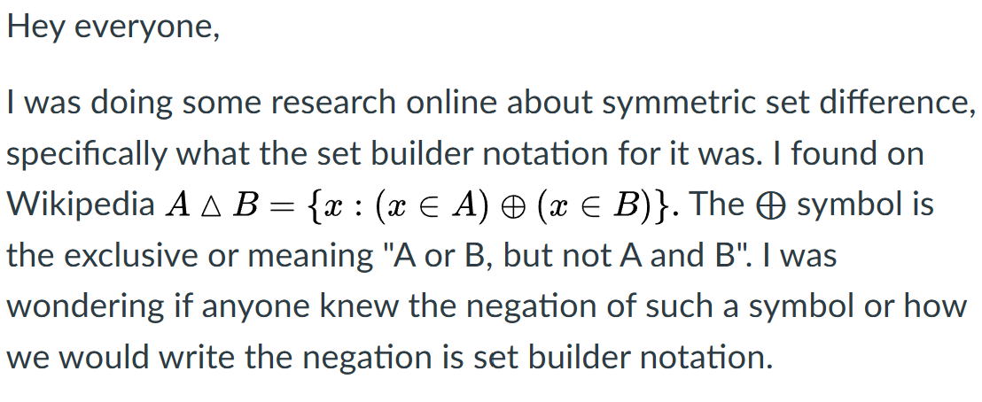 - Using the equivalent expressions from the preceding item, we have \begin{align*} (A \Delta B)^c & = \Bigl\{ x \in U : \lnot \bigl( \bigl( x \in A \bigr) \oplus \bigl( x \in B \bigr) \bigr) \Bigr\} \\ & = \Bigl\{ x \in U : \bigl( x \in A \bigr) \Leftrightarrow\bigl( x \in B \bigr) \Bigr\} \end{align*}