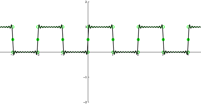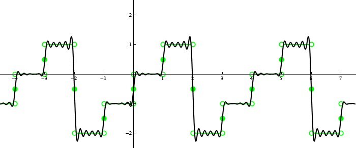 \tilde{f}_{\!\!\rm Fourier}(x) = \begin{cases} \tilde{f}(x) & \text{if $\tilde{f}$ is continuous at $x$} \\[10pt] \tfrac{1}{2}\!\! \bigl(\tilde{f}(x-)+\tilde{f}(x+)\bigr) & \text{if $\tilde{f}$ is not continuous at $x$}