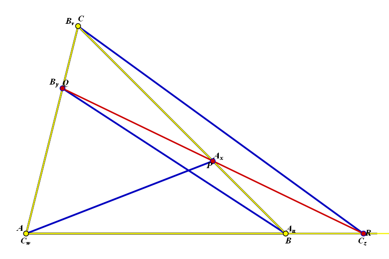 At the beginning of the animation we have the following values: $u = x$, that is $A_u = A_x$, $v = y$, that is $B_v = B_y$, $w = z = \tfrac{1}{xy}$, $C_w = C_z$. That is the yellow and the blue cevians coincide. Since $z = \dfrac{1}{xy}$ we have $xyz = 1$. By Ceva's theorem the cevians $AA_x = AA_v, BB_y = BB_v, CC_z = CC_w$ are concurrent; they intersect at the red point. In this case the points $P, Q$ and $R$ coincide.