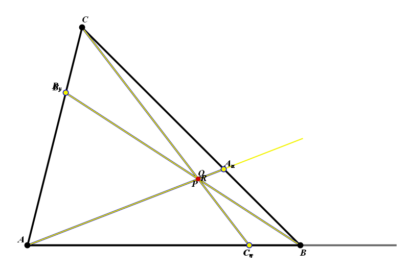 The red point $Q$ is the intersection of dark blue $BB_y$ and yellow $CC_w$.