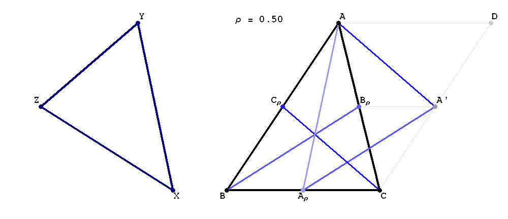 A median of a triangle is just a special cevian. In the animation below, in each scene instead of three medians, you will see three cevians, each joining a vertex of $T$ to the point which divides the opposite side in the ratio $\rho:(1-\rho)$ with $\rho \in [0,1]$. In the animation these cevians are $AA_\rho, BB_\rho$ and $CC_\rho$ in different shades of blue. As "proved" in the animation, three such cevians also form a triangle. The navy blue reflection $XYZ$ of that triangle we call Ceva's triangle of $T$. We denote it by $\mathcal{C}_\rho(T)$. Notice that $\rho$ can be an arbitrary real number, not restricted to $[0,1]$ as in the animation. |